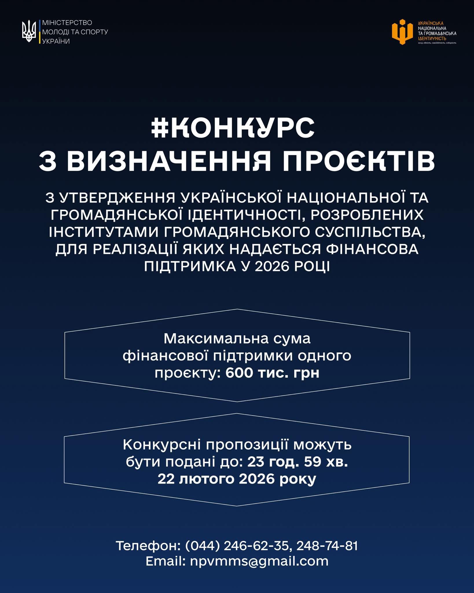 Міністерство молоді та спорту України продовжує термін подачі пропозицій на Конкурс з визначення проєктів з утвердження української національної та громадянської ідентичності, розроблених інститутами громадянського суспільства, для реалізації яких надається фінансова підтримка у 2026 році