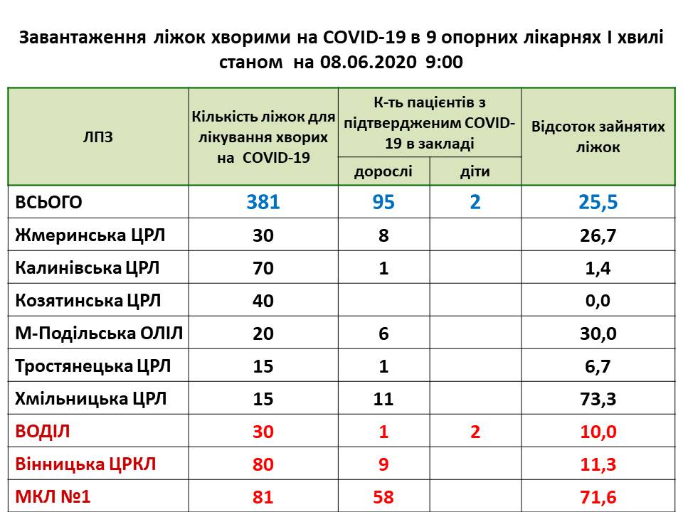 Інформація про завантаження ліжок хворими на COVID-19 в 9 опорних лікарнях І хвилі станом на 08.06.2020