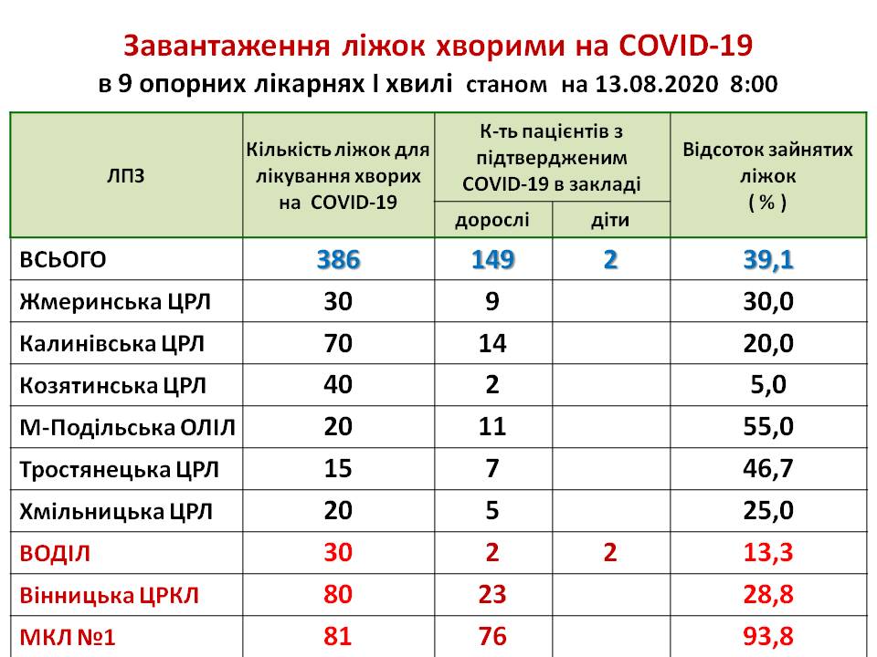 Інформація про завантаження ліжок хворими на COVID-19 в 9 опорних лікарнях І хвилі станом на 13.08.2020