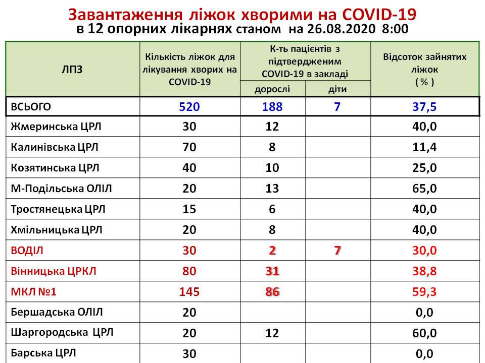 Інформація про завантаження ліжок хворими на COVID-19 в 9 опорних лікарнях І хвилі станом на 26.08.2020