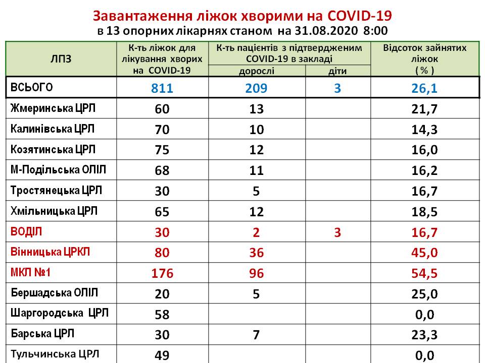 Інформація про завантаження ліжок хворими на COVID-19 в опорних лікарнях станом на 31.08.2020