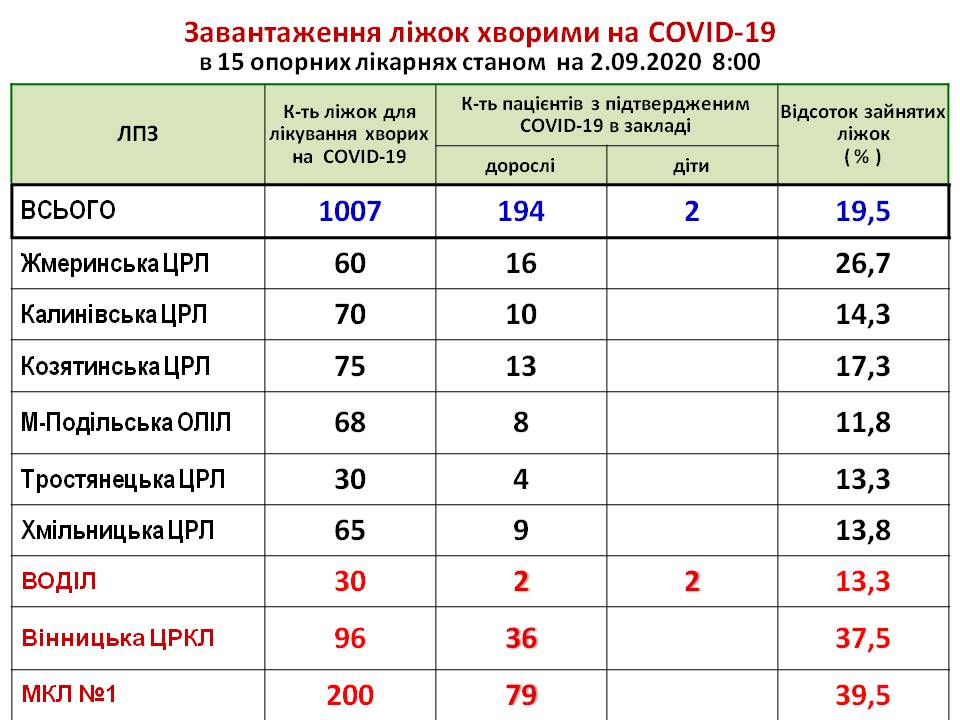 Інформація про завантаження ліжок хворими на COVID-19 в опорних лікарнях області станом на 02.09.2020
