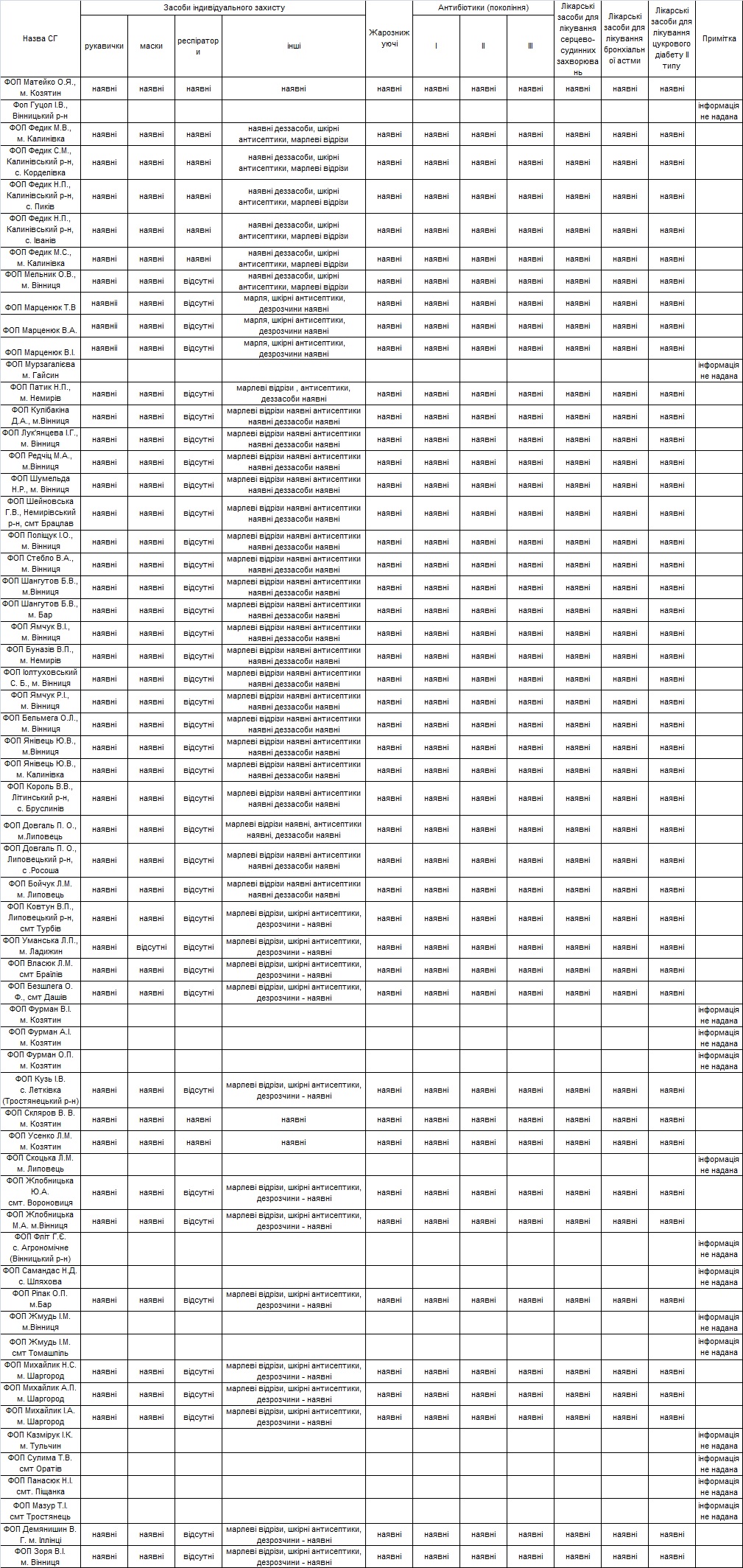 Наявність засобів індивідуального захисту, анитибіотиків та медикаментів в аптечних закладах області