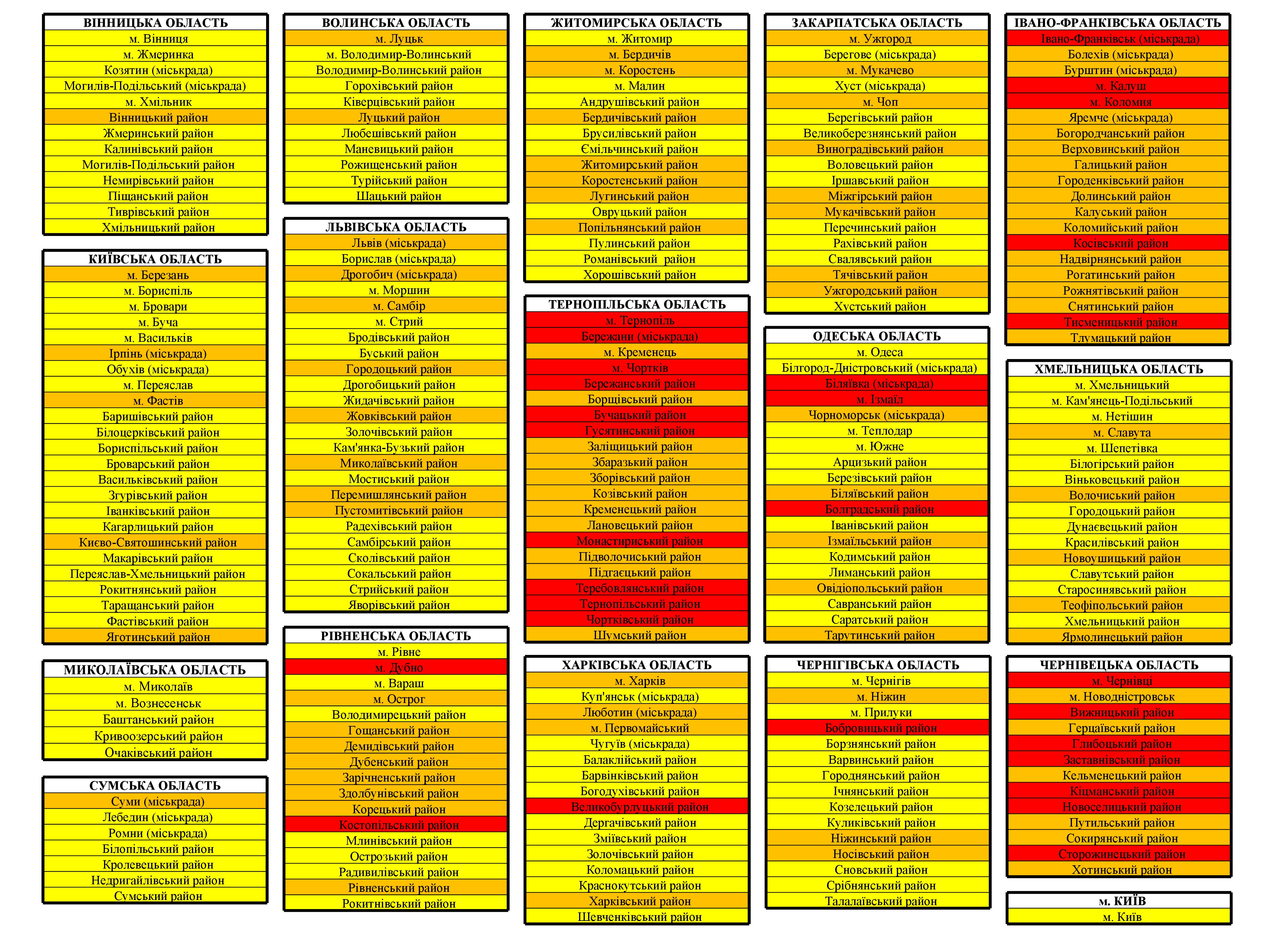 Державна комісія з питань ТЕБ та НС на засіданні 3 вересня переглянула поділ регіонів за рівнями епідемічної небезпеки COVID-19. «Червоний» рівень встановлено у 29 адміністративно-територіальних одиницях, «помаранчевий» — у 89, «жовтий» — у 139. Про це повідомив Міністр охорони здоров’я Максим Степанов на брифінгу за результатами засідання комісії.