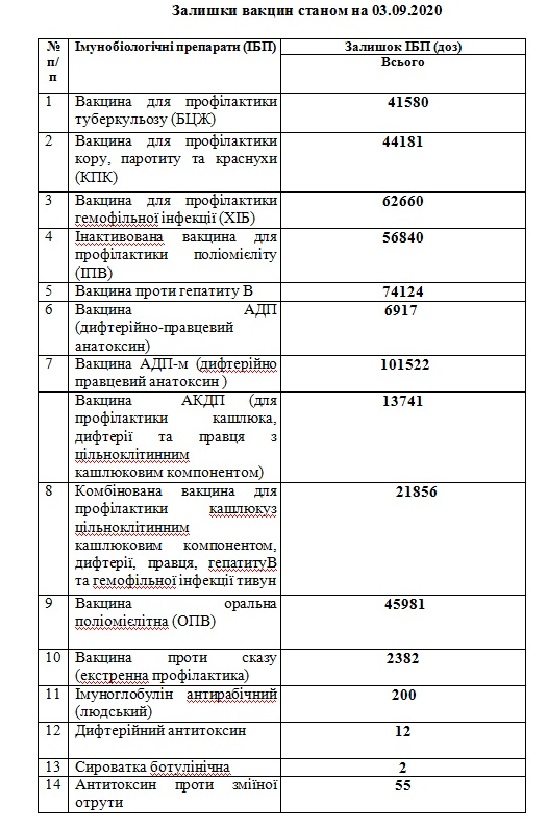 Залишки вакцин станом на 03.09.2020