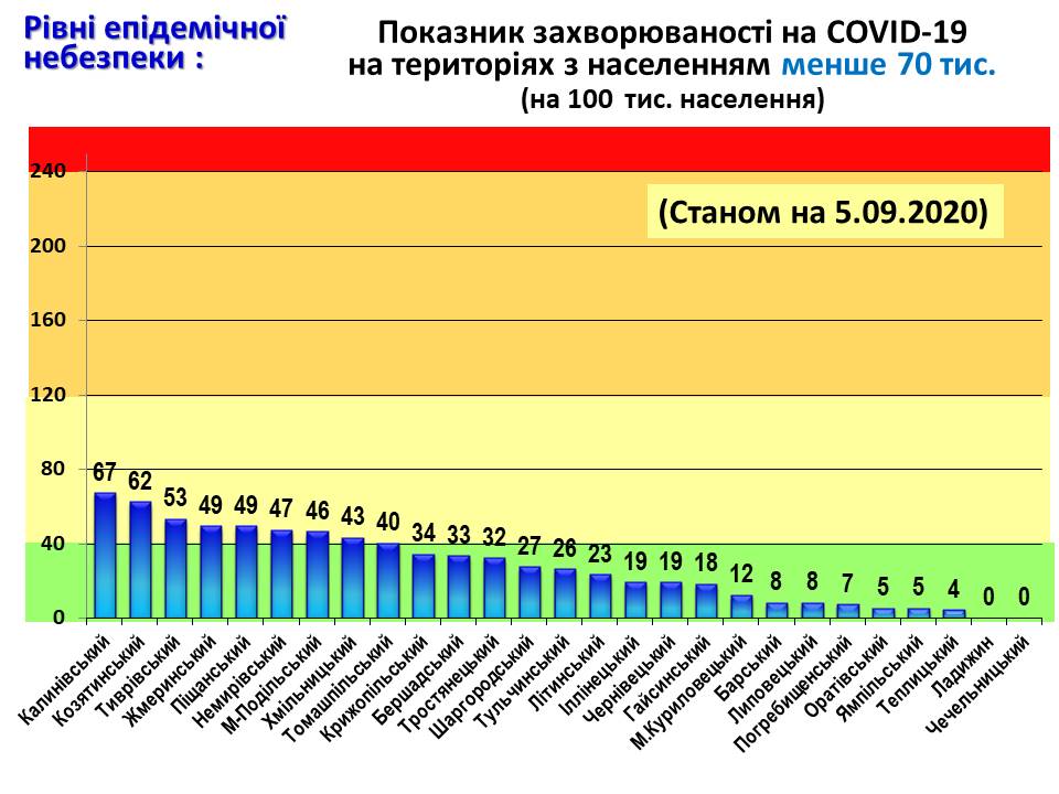 Показник захворюваності на COVID-19 на територіях з населенням менше 70 тисяч (на 100 тис. населення) станом на 5 вересня 2020 рок