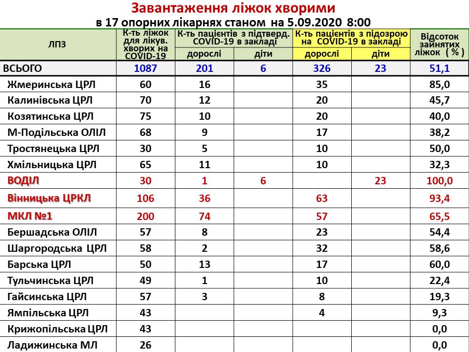 Інформація про завантаження ліжок хворими на COVID-19 в опорних лікарнях області станом на 05.09.2020