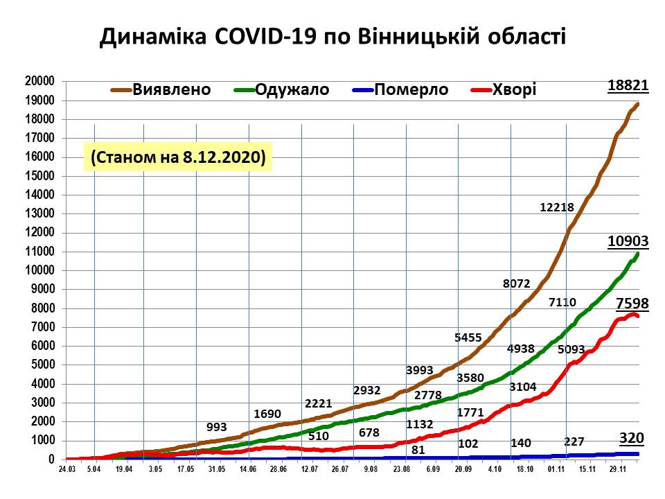 Всього в області зареєстровано 320 летальних випадків. За минулу добу зареєстровано 4 летальних випадки.