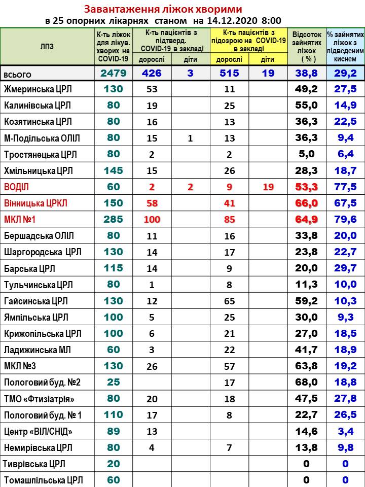 За інформацією Департаменту охорони здоров’я та реабілітації ОДА, в 25 опорних лікарнях області, станом на ранок 14 грудня, на стаціонарі із підтвердженим COVID-19 перебуває 426 дорослих та 3 дітей, з підозрою на коронавірус – 515 дорослих та 19 дітей.