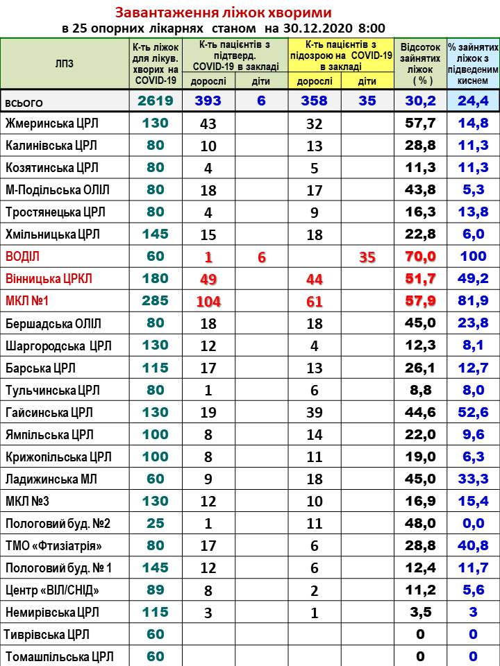 За інформацією Департаменту охорони здоров’я та реабілітації ОДА, в 25 опорних лікарнях області, станом на ранок 30 грудня, на стаціонарі із підтвердженим COVID-19 перебуває 393 дорослих та 6 дитина, з підозрою на коронавірус – 358 дорослих та 35 дітей. На апараті ШВЛ – 3 пацієнта, СРАР - 42, кисень – 415. На даний час розгорнуто 2 619 ліжка.