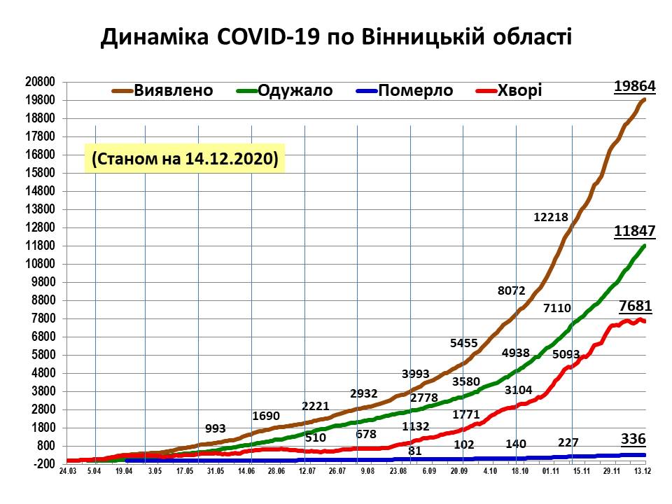 Одужали 11847 особи, в т.ч. 577 дитини та 1134 медпрацівники. На даний час хворіє 7681 осіб, в т.ч. 276 дітей та 555 медпрацівників. За останню добу захворіло 7 медичних працівників.