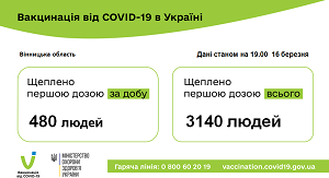 За минулу добу в Україні проти COVID-19 було щеплено 8928 осіб. З них вакциновано 1 дозою – 8928 людей, завершили вакцинацію (отримали 2 дози) – 0 осіб. Усього з початку кампанії з вакцинації щеплено 62 083 особи, всі вони отримали 1 дозу вакцини.