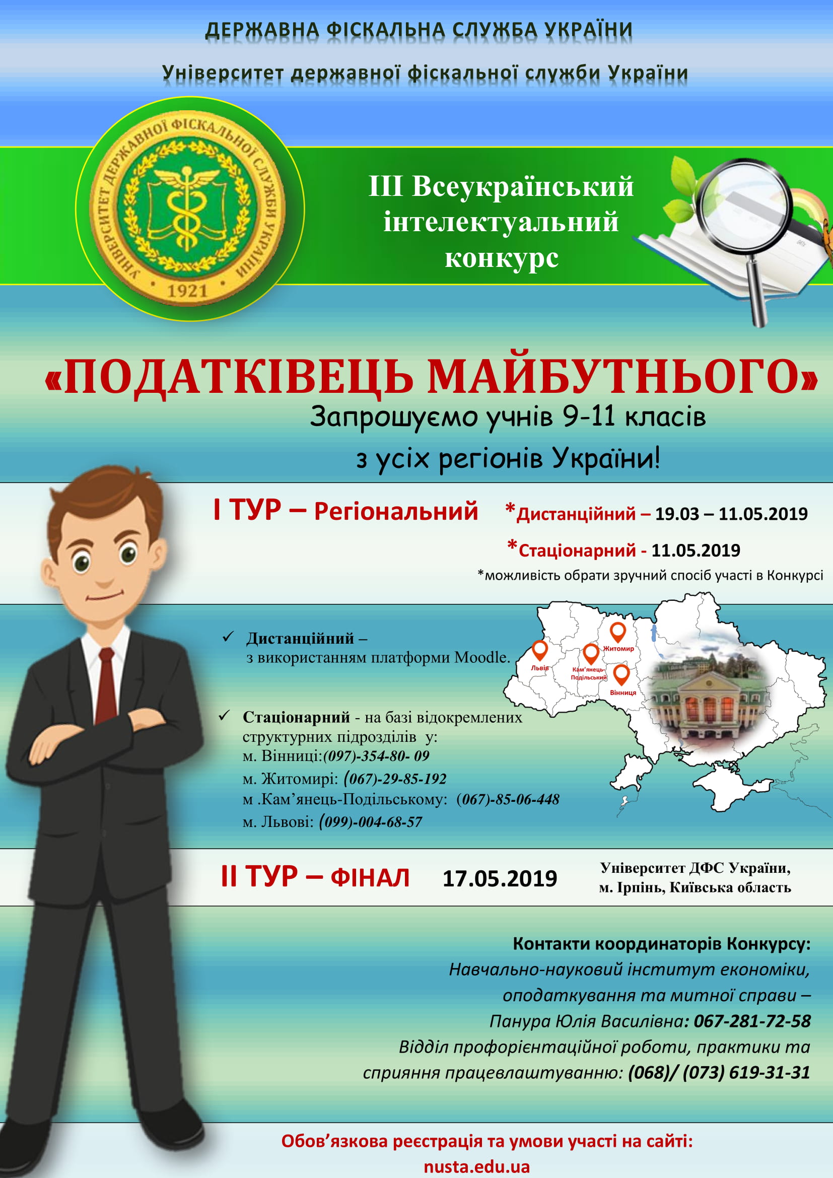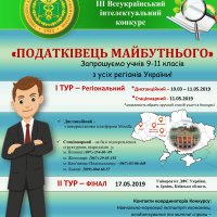 До участі в конкурсі запрошуються учні 9-11 класів. Конкурс «Податківець майбутнього» проводиться Університетом державної фіскальної служби України з метою пошуку, підтримки талановитих учнів, роз’яснення ролі та значення Державної фіскальної служби України, популяризації податкової та митної грамотності серед учнів, аналізу та запровадження сучасних інноваційних освітніх технологій навчання в Україні. Фінал Конкурсу – 17.05.2019 р. Переможець інтелектуального конкурсу за І місце нагороджується дипломом І ступеня, який дає право першочергового вступу до Університету.