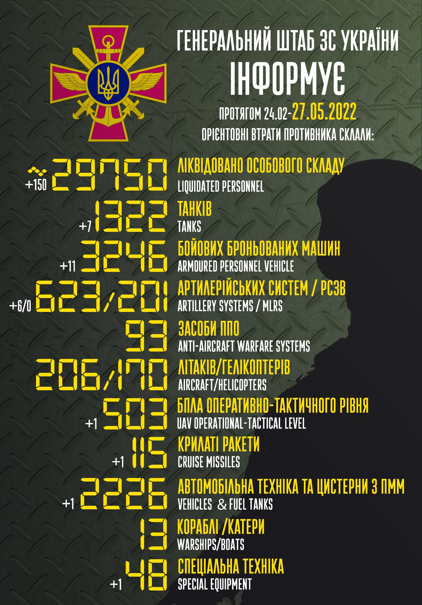 Загальні бойові втрати противника з 24.02 по 27.05 орієнтовно склали