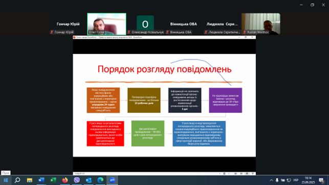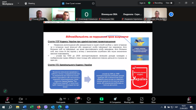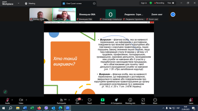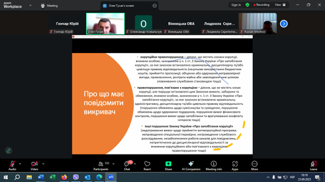 Про це, а також про умови, за яких особа є викривачем, шляхи здійснення повідомлень про корупційні або пов’язані з корупцією правопорушення, порядок розгляду повідомлень викривача, права та гарантії захисту викривачів та їх близьких осіб відповідно до Закону України «Про запобігання корупції», кейси викривання тощо, йшлося під час навчання, яке проведено Сектором з питань запобігання та виявлення корупції обласної військової адміністрації 25 вересня 2025 року в режимі zoom-конференції для працівників апарату, структурних підрозділів обласної військової адміністрації, підприємств, установ, організацій, які належать до сфери її управління.